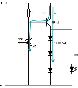 如果電池兩端小于4.2V,TL431不吸收電流,即下面的Ib=0,所以Ic=0,三級管關(guān)閉,充電電流就還是通過電池。