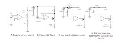 A. 運(yùn)放電流源 B. 垂直翻轉(zhuǎn) C. 用分流電壓作為輸入 D. 分流電阻成為輸入電壓源