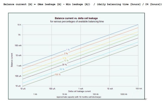 如果所有電芯的自放電一致,那么也不需要均衡;但如果不一致,自放電電流有差異時,就會造成SOC差異,均衡就是要彌補這個自放電電流差異。另外,由于每天的平均均衡時間是有限的,而自放電是每天持續(xù)的,所以時間因素也要考慮進來。上圖是按照每天不同的均衡時間,畫出的關于均衡電流與自放電電流差值的一個圖。所以如果知道了電芯的自放電率,就可以計算出一個需要的均衡電流,不過這個計算結果是一個下限值,實際的均衡能力一定要大于這個值。