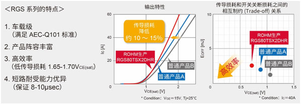 尤其是在電動壓縮機(jī)和PTC加熱器中,由于驅(qū)動頻率較低,故對傳導(dǎo)損耗的重視程度高于開關(guān)特性,RGS系列的出色表現(xiàn)已經(jīng)獲得客戶的高度好評。