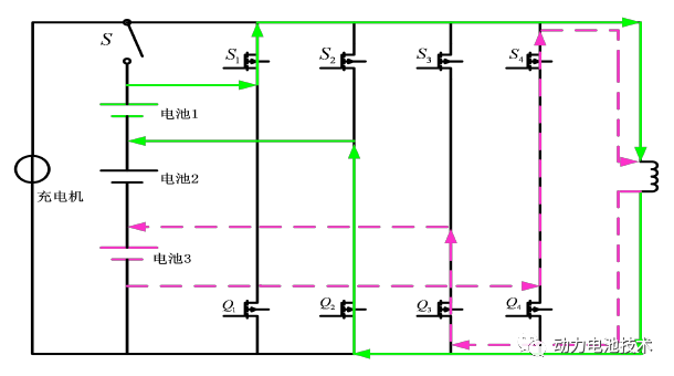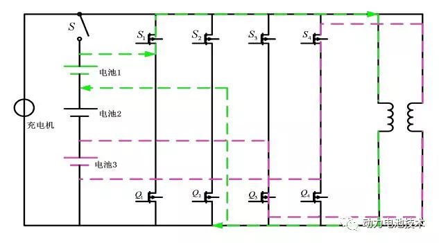 控制原理如下:設(shè)電池組內(nèi) B4 電壓最高,B2 電壓最低,控制繼電器 S5、S3、Q4、Q2 閉合,此時(shí)兩節(jié)單體電池并聯(lián),兩單體電池自動(dòng)均衡,電壓趨于一致。該拓?fù)涞娜秉c(diǎn)是充電過(guò)程中不能進(jìn)行均衡,只能靜置去極化時(shí)候進(jìn)行并聯(lián)均衡。