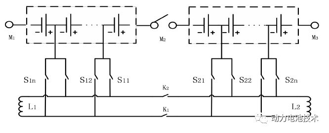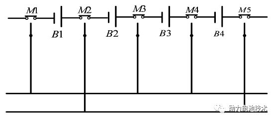 如下圖所示的并聯(lián)拓?fù)浣Y(jié)構(gòu),每節(jié)單體電池都有一個(gè)單刀雙擲的開(kāi)關(guān)繼電器,所以 n 節(jié)串聯(lián)電池組內(nèi)需要 n+1 個(gè)繼電器。