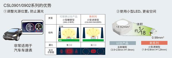 隨著目標(biāo)應(yīng)用的多功能化,包括車(chē)速表在內(nèi)的汽車(chē)內(nèi)飾設(shè)備中,對(duì)于用來(lái)顯示圖標(biāo)、并照亮整個(gè)面板的照明光源用的LED也要求小型化。