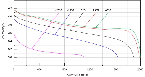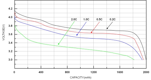 下圖顯示不同放電率下電壓與電池容量的關(guān)系。放電率愈高,電池容量愈低。溫度低時,電池容量也會降低。