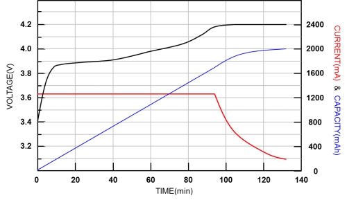 下圖所顯示為一典型的鋰電池充電特性曲線。當(dāng)電池電壓等于最高充電電壓,且充電電流降低至C/10,電池即視為完全充電。