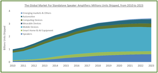 1 資料來自SAR Insight & Consulting首席研究員Peter Conney于2017年第4季度發(fā)布的音頻功率放大器報(bào)告:市場(chǎng)增長(zhǎng)、通道數(shù)量、放大器類型、輸入類型、類、喇叭保護(hù)。更新數(shù)據(jù)來自SAR Insight & Consulting于2019年第1季度發(fā)布的音頻信號(hào)鏈IC預(yù)測(cè)DATAbase。