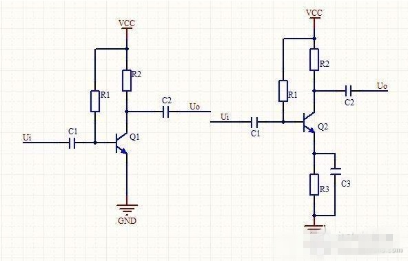 圖中所示電路中Q1發(fā)射極直接接地,Q2中發(fā)射極通過電容C3接地,因為C3的容量較大,對交流信號的容抗很小而呈通路,這樣對交流信號而言就是發(fā)射極相當于接地,所以這個是共發(fā)射極放大器。