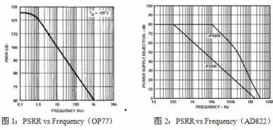 任何電源電壓的變化都會引起運放輸入偏置電流的變化,圖1中OP77的PSRR在DC時是126dB(0.5uV/V),電源電壓的變化是一個潛在的低頻噪聲源。在低噪聲運放的應用中,降低電源的紋波和提高電源的調整率都很重要,電源調整率不足通常會引起討厭的低頻噪聲。