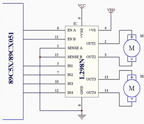 1、15腳是輸出電流反饋引腳,其它與L293相同。在通常使用中這兩個引腳也可以直接接地。上圖是其與51單片機連接的電路圖