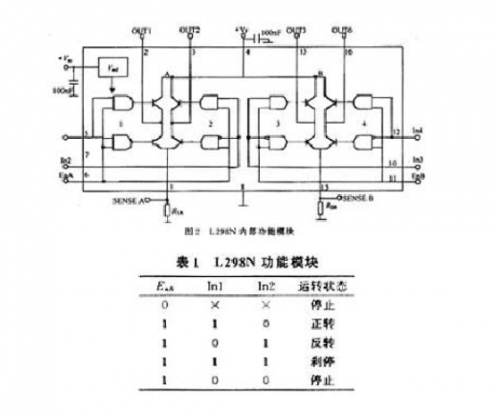 In3,In4的邏輯圖與表1相同。由表1可知EnA為低電平時,輸入電平對電機控制起作用,當EnA為高電平,輸入電平為一高一低,電機正或反轉。同為低電平電機停止,同為高電平電機剎停。 L298控制器原理如下: