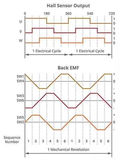 圖 2:六步霍爾效應(yīng)輸出和梯形電機(jī)相位