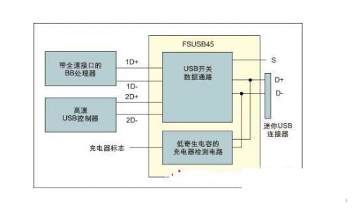 隨著目前的市場趨勢向單一USB充電器/數(shù)據(jù)端口的轉(zhuǎn)變,特殊應(yīng)用USB開關(guān)已經(jīng)成為帶充電器檢測功能的手機設(shè)計中的一種常規(guī)配置。圖2是這種開關(guān)應(yīng)用的一個范例。