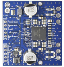 It contains a variety of digital/analog input, output and set-up/selection features. It also contains one on-board power supply (5 V buck converter), so only one external power supply (PVDD) is necessary.