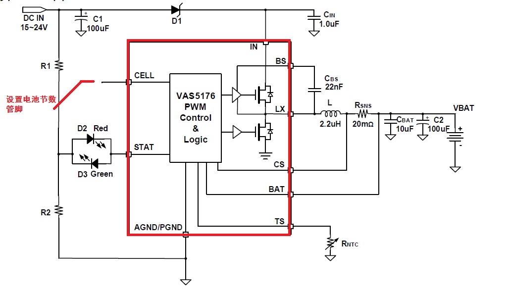VAS5176 是一款8.5V-24V 輸入,高度集成的開關(guān)型鋰離子/聚合物電池充電芯片, 以高精度調(diào)節(jié)2A充電電流,和電池電壓。它密切監(jiān)測電池組的溫度只在設置安全溫度范圍下允許充電,還提供電池檢測、預充電調(diào)節(jié)、充電飽充和充電狀態(tài)指示等功能。熱反饋調(diào)節(jié)可降低充電電流并維持芯片內(nèi)部溫度以不超過125°C 的條件下工作,如果結(jié)溫超過155°C,它將進行過熱關(guān)斷保護,停止工作以確保可靠度。