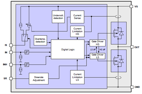 圖3. IFX007T應(yīng)用電路:一個IFX007T半橋(負(fù)載接地)