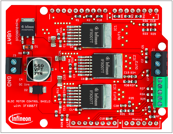 On board of the Motor Control Shield are three IFX007T NovalithICTM. Each is featuring one P-channel high sideMOSFET and one N-channel low side MOSFET with an integrated driver IC in one package. Due to the P-channelhigh side switch a charge pump is not needed.