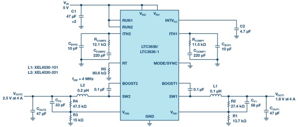 LTC3636是一款雙通道、每路輸出6 A、高效率單芯片降壓穩(wěn)壓器,能夠采用最高20 V的輸入電源電壓?删幊涕_關(guān)頻率可以設(shè)置為高達4 MHz。高開關(guān)頻率顯著減小了電感和電容的尺寸和值,但與許多高頻解決方案不同,LTC3636還保持了高效率,可使用一些具有更低交流損耗和直流損耗的超小尺寸鐵氧體電感。兩個通道錯相180°工作,且開關(guān)脈沖交錯使紋波更低,反過來又可以減少輸入電容值。