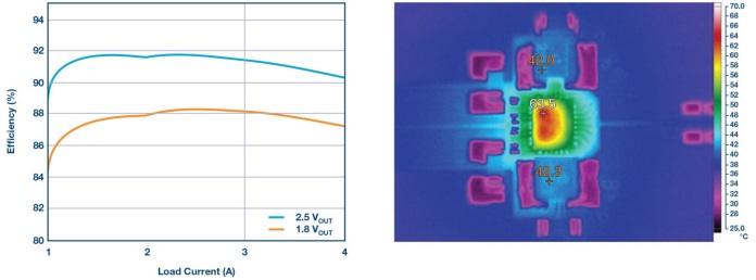 圖1中的雙通道降壓轉(zhuǎn)換器在4 MHz的頻率下運行,并使用非常小的電壓和電容。效率和熱性能如圖2所示。熱圖像顯示低于40°C的溫升,在VIN = 5 V室溫下自然對流。
