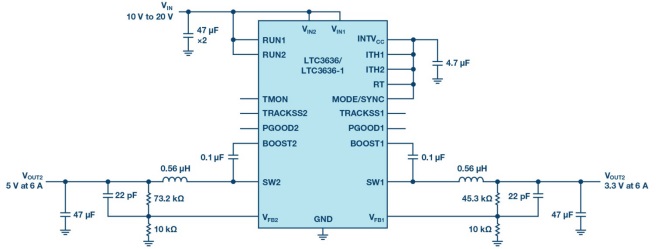 LTC3636穩(wěn)壓器具有低靜態(tài)電流,可在輸出電壓高達5 V時實現(xiàn)高效率。而LT3636-1型號將VOUT范圍擴大至12 V。該降壓穩(wěn)壓器能夠在3.1 V至20 V的輸入電壓范圍內(nèi)工作,同時每通道提供高達6 A的輸出電流。圖3顯示的是一個高效率解決方案,而圖4顯示,其測得的效率在整個工作范圍內(nèi)一直很高。