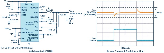 先進的SoC和FPGA電子系統(tǒng)在汽車、交通和工業(yè)應(yīng)用中的激增需要更高性能的電源。這些先進SoC的功率需求不斷增加,基于傳統(tǒng)PWM控制器和MOSFET的解決方案必須采用單片穩(wěn)壓器,以便獲得更小的尺寸、更高的電流能力和更高的效率。LTC3636旨在滿足這些先進的SoC功率需求,同時滿足SoC對方案尺寸和散熱的限制。圖5a顯示兩通道并行的電源的原理圖,在0.85 V的電壓下提供高達12 A電流。當(dāng)VIN為3.3 V時,12 A輸出負載的峰值效率為87%。負載瞬變?nèi)鐖D5b所示。在此設(shè)計中,F(xiàn)B1和FB2引腳連接在一起,和RUN1和RUN2引腳一樣。ITH1和ITH2引腳連接在一起,并設(shè)置外部補償以最大限度地減少穩(wěn)定狀態(tài)下的電流失配以及瞬變。