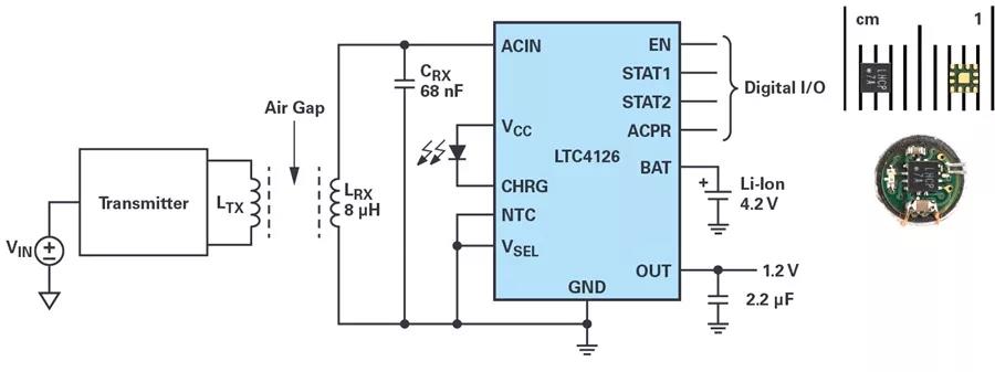 由于LTC4126的高度集成式設(shè)計(jì),只需幾個(gè)外部組件即可創(chuàng)建完整的無(wú)線充電器接收器解決方案。在直徑為6 mm 的應(yīng)用板上,可將整個(gè)設(shè)計(jì)安裝在助聽器或耳塞的內(nèi)部。