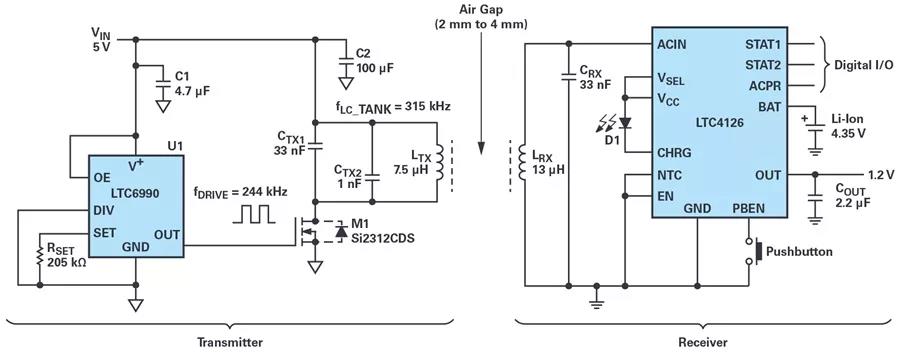 圖4. 具有單晶體管ZVS發(fā)射器和LTC4126接收器的完整無(wú)線充電解決方案。