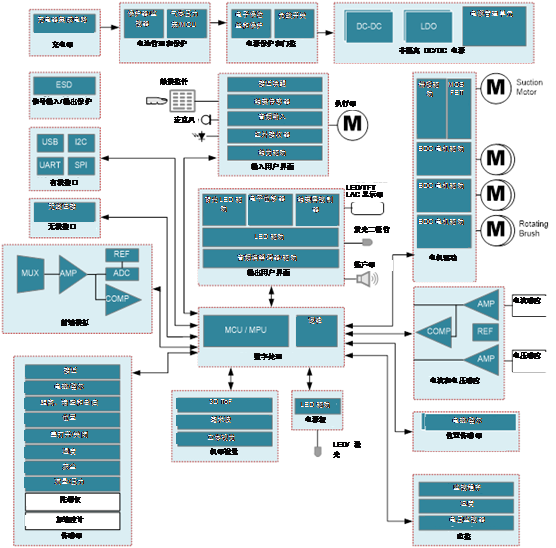 電池壽命和可靠性是真空機器人面臨的兩大設計挑戰(zhàn)。大多數真空機器人都是電池供電的,并從電源座充電。真空機器人的典型框圖如圖1所示。