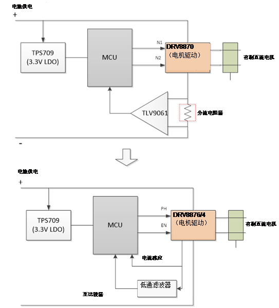 圖3所示為早期一代真空機器人的框圖,其中DRV8870需要外部分流電阻來感應電流,而外部放大器則需要向MCU發(fā)送反饋。這需要額外的電路板空間,增加成本,并增加了布線復雜性和維護。
