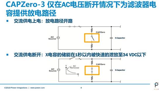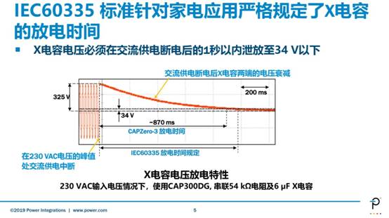 我們常常會(huì)被瞬間斷了電的電源適配器電到,這一現(xiàn)象是因?yàn)槠渲械碾娮璺烹姇r(shí)間不夠快。為防止以上對(duì)用戶造成電氣危害,IEC60335標(biāo)準(zhǔn)對(duì)家電有著嚴(yán)格的X電容的放電時(shí)間要求,標(biāo)準(zhǔn)規(guī)定X電容電壓必須在交流供電斷電后的1秒以內(nèi)泄放至34V以下。CAPZero-3的推出直接反映到用戶的利益是顯而易見的,其可在870毫秒內(nèi)快速將X電容泄放至34V安全電壓以下。究其技術(shù)背后閻先生給大家普及稱, X電容存在于家電的EMI濾波器部分,跨在零線和火線之間,起到短路電磁干擾噪聲的目的,以達(dá)到相關(guān)電磁干擾規(guī)范要求。但隨著電容容量的增大,電阻越小才能保證放電時(shí)間更快,但同時(shí)這也帶來了功耗的增加,CAPZero-3就用于消除X電容的放電電阻功耗。