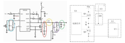 3、降低過沖電壓。在開關(guān)的上下管之間增加緩沖電路,如上左圖的 R4 和 C2 電路,或右圖 D1 和 C2 電路,可以減弱嘯叫,但不能消除嘯叫。