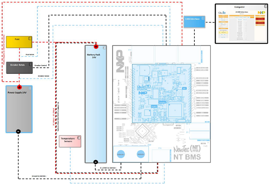 NTBMS is a generic safety reference design for BMS developedin cooperation with NXP. The Battery Management System of Li-Ion battery includes cell monitoring, current sensing, passive cellbalancing, battery breaker control, computation unit for Batteryparameter extraction (such as State of Charge, State of Health)and communication to other ECU through CAN.