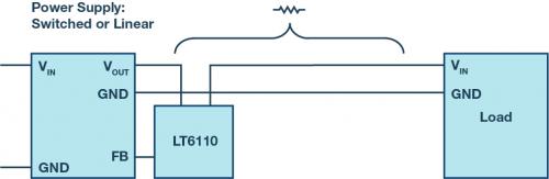 無需額外的一對檢測引線,也可以對電源和負(fù)載之間連接線上的電壓降進(jìn)行補(bǔ)償。對于一些電纜布線復(fù)雜、成本高昂并且所產(chǎn)生的 EMC 干擾很容易耦合到電壓測試引線的應(yīng)用而言,這一點(diǎn)特別有意義。第二種方案是使用LT6110 這類專用線路壓降補(bǔ)償 IC。將此 IC 插入電壓發(fā)生側(cè),并測量進(jìn)入連接線之前的電流。然后根據(jù)測得的電流來調(diào)節(jié)電源的輸出電壓,從而能夠非常精確地調(diào)節(jié)負(fù)載側(cè)電壓,而不用考慮負(fù)載電流。