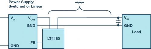 如果在器件工作期間線路電阻可能會(huì)發(fā)生變化,可使用LT4180 這類元件,在負(fù)載側(cè)具有輸入電容時(shí),通過交流信號對連接線電阻進(jìn)行虛擬預(yù)測,從而為負(fù)載端提供高精度電壓。