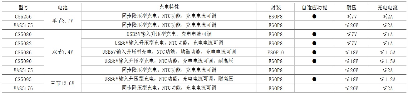 CS5090 CS5090E是一款5V輸入,最大1.5A充電電流,支持雙節(jié)鋰電池串聯(lián)應(yīng) 用,鋰離子電池的升壓充電管理IC.CS5090E集成功率MOS,采用異步開關(guān)架構(gòu),使其在應(yīng)用時僅需極少的外圍器件,可有效減少整體方案 尺寸,降低BOM成本 。 CS5080/CS5082 ESOP-8 4.5V-6.5V 5V USB輸入,最大1.5A充電電流,帶NTC,雙節(jié)鋰電升壓充電管理電路