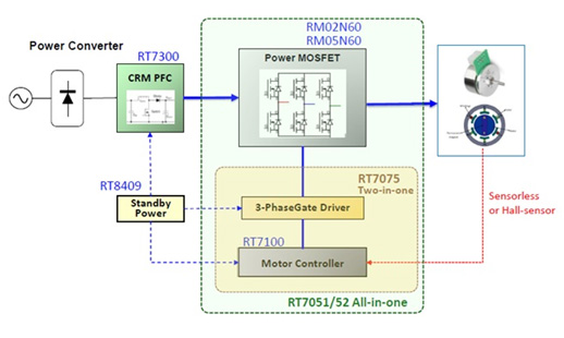 Richtek為市場提供的直流無刷電機驅(qū)動解決方案由電機控制器、門極驅(qū)動器、功率元件等產(chǎn)品以及由電機控制器和門極驅(qū)動器集成在一起的二合一產(chǎn)品和將電機控制器、門極驅(qū)動器及功率元件都集成在一起的三合一產(chǎn)品組合而成。組成完整的電機控制系統(tǒng)所需要的PFC控制器、電源轉(zhuǎn)換器等產(chǎn)品也都齊備,因而可以滿足用戶在應(yīng)用上的所有需求。