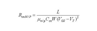 低導通電阻是模擬開關(guān)在音頻切換用途時的主要選擇因素。值得注意的是,導通電阻是針對具體的VCC 、VIN(電壓輸入)及給定負載電流而定義的。在晶體管級,RON為器是長度(L)、寬度(W)、電子與空穴遷移率、氧化層電容、門限電壓及信號電壓的函數(shù)。如下所示:
