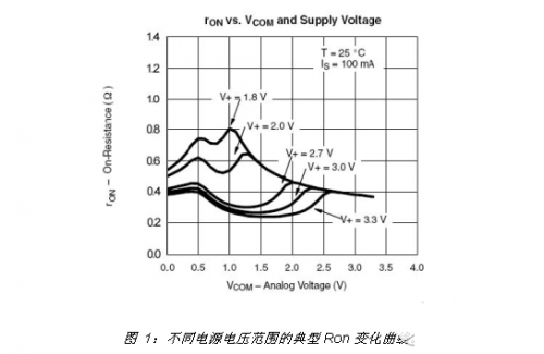 RON會隨著電源電壓的增加而減小。圖1顯示了上海英聯(lián)電子科技有限公司(下文簡稱英聯(lián)電子)的UM4684在不同電源電壓上測得的RON。導通電阻平坦度(RFLAT)即表示RON隨著VIN在0V至VCC或V-至V+)間變化而變化的情況,它是引起THD的主要原因。