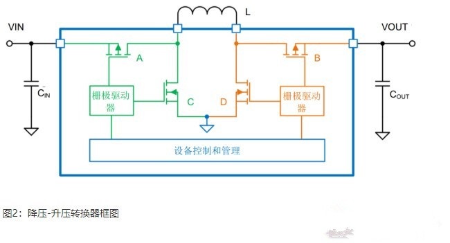 降壓-升壓轉(zhuǎn)換器將降壓轉(zhuǎn)換器(圖1中的綠色部分)與升壓轉(zhuǎn)換器(圖1中的橙色部分)合并在同一結(jié)構(gòu)中,從而可以有效地升高和降低輸出電壓。控制環(huán)路可以根據(jù)實(shí)際的輸入電壓和編程設(shè)定的輸出電壓來決定設(shè)備是否需要在降壓或升壓模式下運(yùn)行。