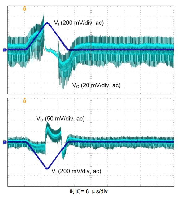 圖3:TPS63802在VI = VO = 3.3V, ΔVI = ±0.5V時的線路瞬態(tài)響應(yīng)