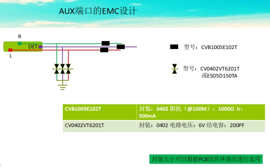 再此也設計出一般AUX的靜電以及EMI防護方案: