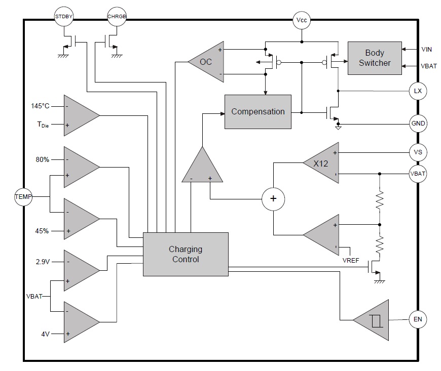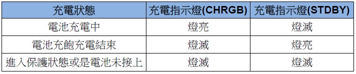 IC 進(jìn)入正常充電時(shí)CHRGB 燈號(hào)會(huì)恆亮,充電截止時(shí)CHRGB 燈號(hào)會(huì)熄滅,當(dāng)電池充飽後又放電至Recharge 電壓4V (約95%的截止電壓),而此時(shí)輸入電源還在的話,CHRGB 燈號(hào)會(huì)再度亮起來(lái),IC 會(huì)開始充電直到充電截止,STDBY 燈則相反。