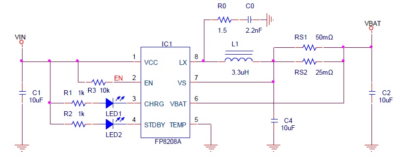 最大充電電流可利用VS pin 與VBAT pin 中間的RS 電阻做設(shè)定,電流最大3.5A,設(shè)定公式如下: