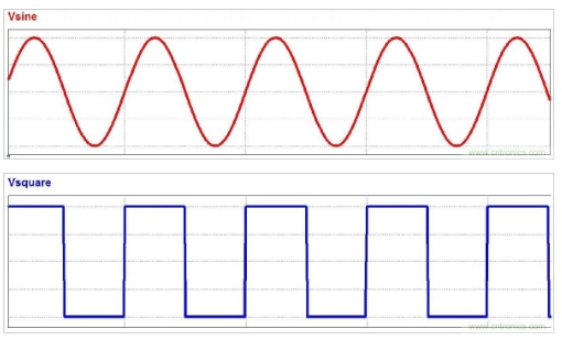 正弦波(頂部)和方波(底部)的時(shí)域表示