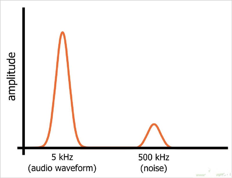 讓我們假設(shè)我們有一個(gè)由完美的5 kHz正弦波組成的音頻信號(hào)。我們知道時(shí)域中的正弦波是什么樣的,在頻域中我們只能看到5 kHz的頻率“尖峰”。現(xiàn)在讓我們假設(shè)我們激活一個(gè)500 kHz振蕩器,將高頻噪聲引入音頻信號(hào)。在示波器上看到的信號(hào)仍然只是一個(gè)電壓序列,每個(gè)時(shí)刻有一個(gè)值,但信號(hào)看起來會(huì)有所不同,因?yàn)樗臅r(shí)域變化現(xiàn)在必須反映5 kHz正弦波和高頻噪音波動(dòng)。然而,在頻域中,正弦波和噪聲是在該一個(gè)信號(hào)中同時(shí)存在的單獨(dú)的頻率分量。正弦波和噪聲占據(jù)了信號(hào)頻域表示的不同部分(如下圖所示),這意味著我們可以通過將信號(hào)引導(dǎo)通過低頻并阻擋高頻的電路來濾除噪聲。