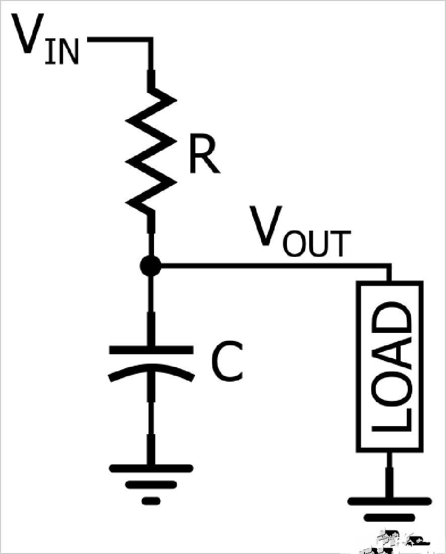 如圖所示,通過將一個(gè)電阻與信號(hào)路徑串聯(lián),并將一個(gè)電容與負(fù)載并聯(lián), 可以產(chǎn)生RC低通響應(yīng)。在圖中,負(fù)載是單個(gè)組件,但在實(shí)際電路中,它可能更復(fù)雜,例如模擬到數(shù)字轉(zhuǎn)換器,放大器或示波器的輸入級(jí),用于測(cè)量濾波器的響應(yīng)。