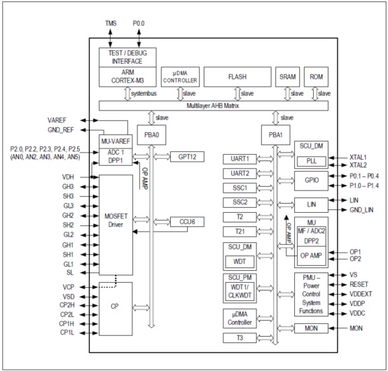 It includes six fully integrated NFET drivers optimized to drive a 3-Phase motor via six external power NFETs, acharge pump enabling low voltage operation and programmable current along with current slope control foroptimized EMC behavior. Its peripheral set includes a current sensor, a successive approximation ADCsynchronized with the capture and compare unit for PWM control and 16-bit timers. A LIN transceiver is also integrated to enable communication to the device along with a number of general purpose I/Os. It includes anon-chip linear voltage regulator to supply external loads.It is a highly integrated automotive qua