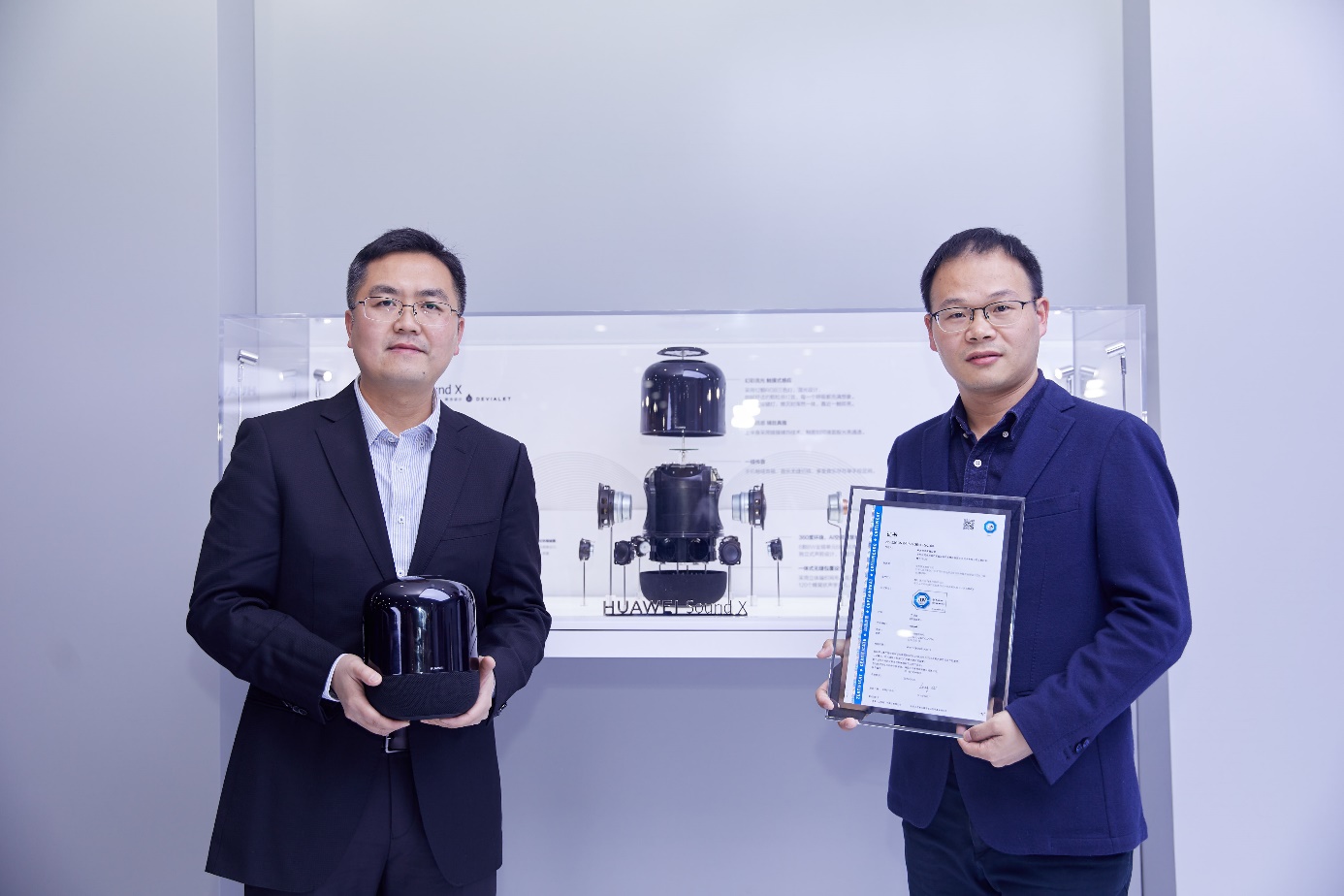 TUV南德電子電氣研發(fā)部經(jīng)理唐杰(左)為華為終端智能音箱產(chǎn)品總經(jīng)理何瑞峰(右)頒發(fā)證書