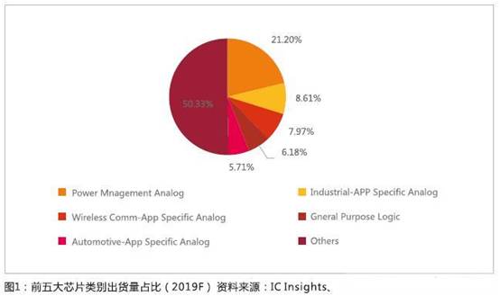 正是由于應(yīng)用的廣泛,所以電源管理芯片出貨量在所有類別芯片中排名第一。根據(jù)IC Insights的數(shù)據(jù),以出貨量計(jì)算的話,預(yù)計(jì)前五大IC類別有四個(gè)是模擬器件。而且模擬器件總數(shù)將占2019年預(yù)計(jì)發(fā)貨的3017億個(gè)IC總數(shù)的55%。電源管理模擬器件預(yù)計(jì)將占IC總量的21%,出貨量預(yù)計(jì)為639.69億顆,預(yù)計(jì)將超過排名第二和第三名類別出貨量的總和。