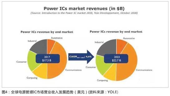 根據(jù)YOLE的數(shù)據(jù),通信市場(chǎng)占據(jù)最主要的電源管理芯片市場(chǎng),即將到來的5G大規(guī)模布局,將進(jìn)一步提升通信領(lǐng)域電源管理芯片需求。同時(shí),汽車電氣化以及工業(yè)4.0升級(jí),也將成為電源管理芯片的助推劑。
