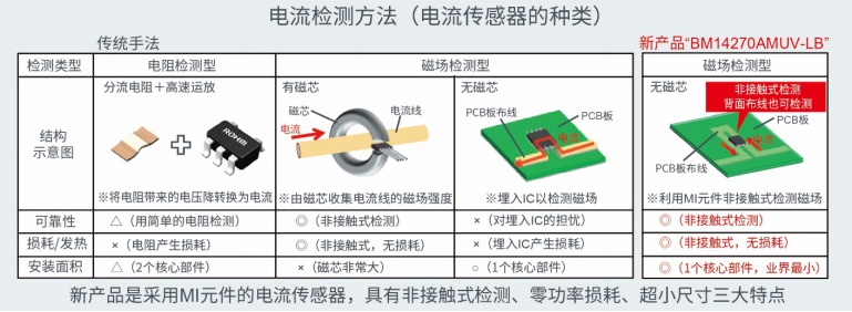 以往采用霍爾元件的產(chǎn)品,如果不在電流傳感器內(nèi)布設(shè)電流線,就無法檢測電流,而布線則會產(chǎn)生損耗、發(fā)熱問題,萬一電流傳感器損壞,可能會導(dǎo)致整個系統(tǒng)停動。而ROHM新產(chǎn)品利用MI元件的高靈敏度特性,能以非接觸方式檢測電流,即使在使用高電壓的應(yīng)用中,也不會發(fā)生額外的損耗和發(fā)熱問題,并且無需絕緣,設(shè)計更簡潔,有助于提高系統(tǒng)的可靠性。